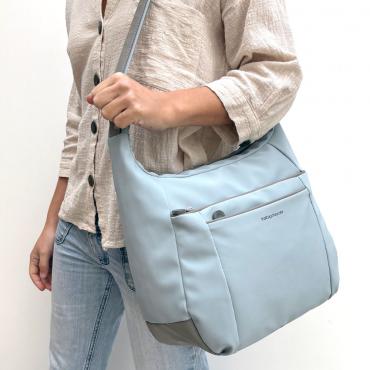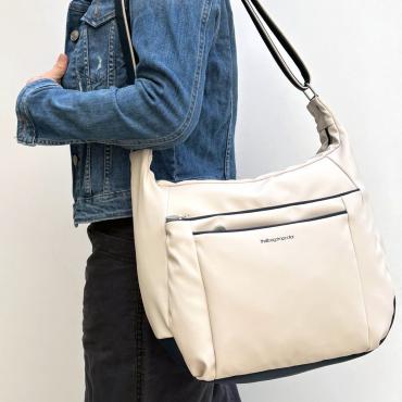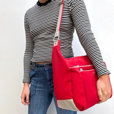 Con correa regulable, dos bolsillos frontales y bolsillo interno.
