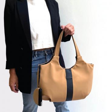 DESCRIPCIÓN Nueva cartera Free con doble asa, bolsillo lateral, en su interior y accesorio colgante. MATERIAL: Pvc MEDIDAS: 26 cm alto x 42 cm ancho x 8 cm profundidad.
